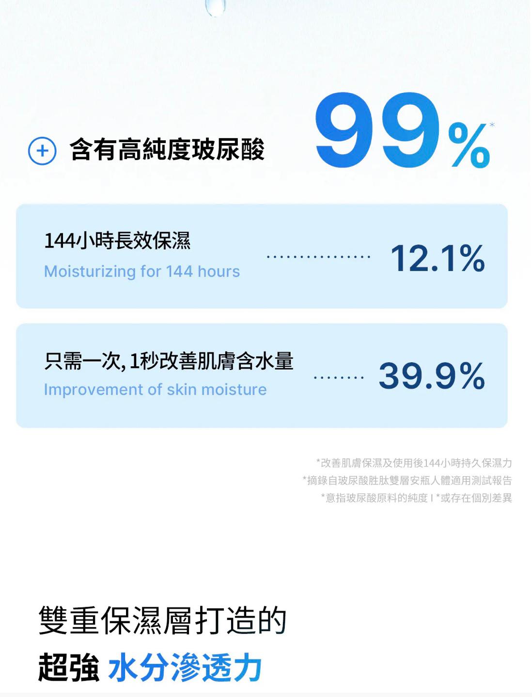 ✅ 99%高純度玻尿酸,1秒爆水滲透角質層,保濕效力長達144小時*