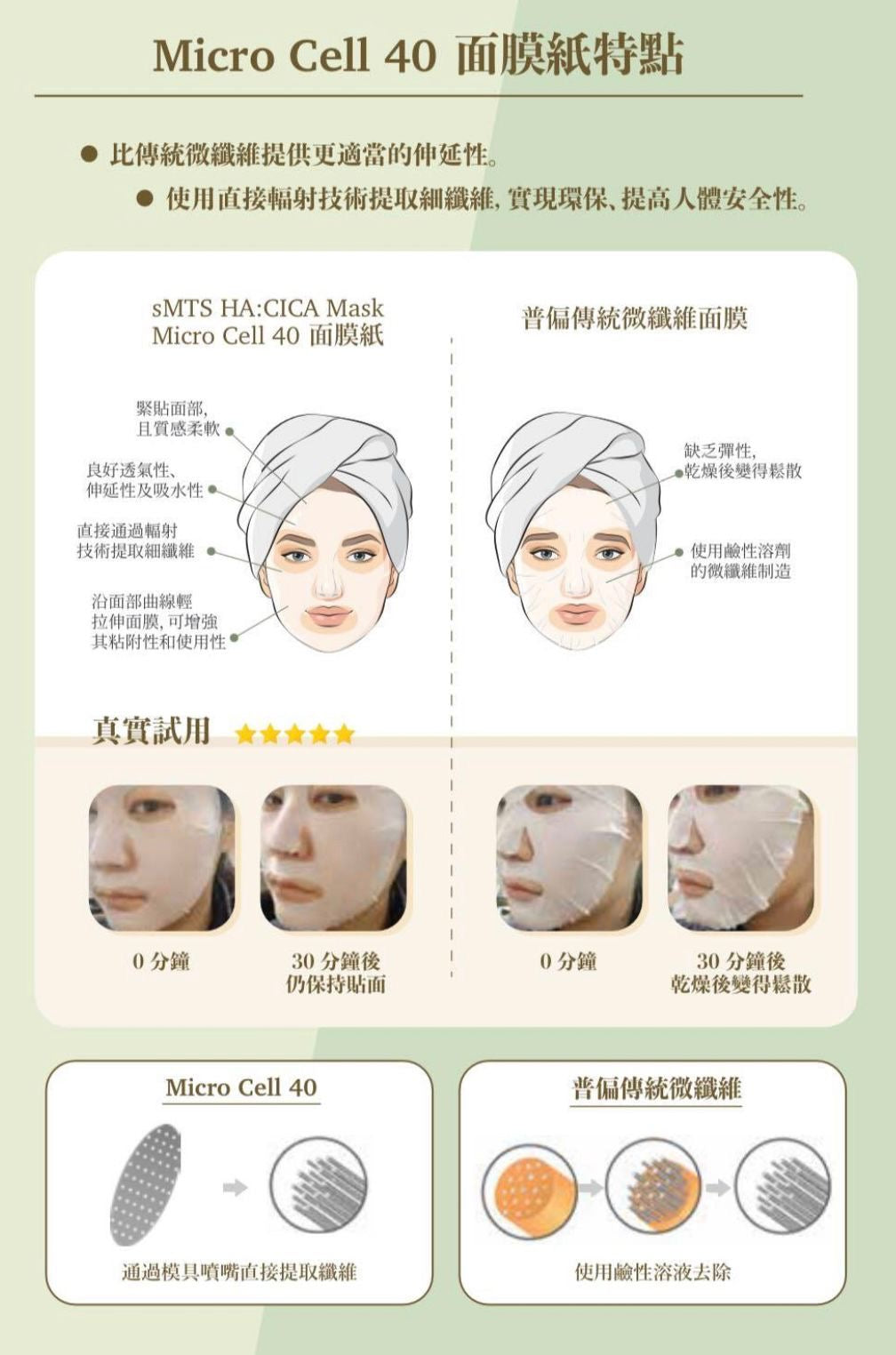 使用Micro Cell 40 面膜紙特點,比傳統微纖維提供更適當的伸延性,緊貼面部,且質感柔軟,良好透氣性、伸延性及吸水性👍🏻